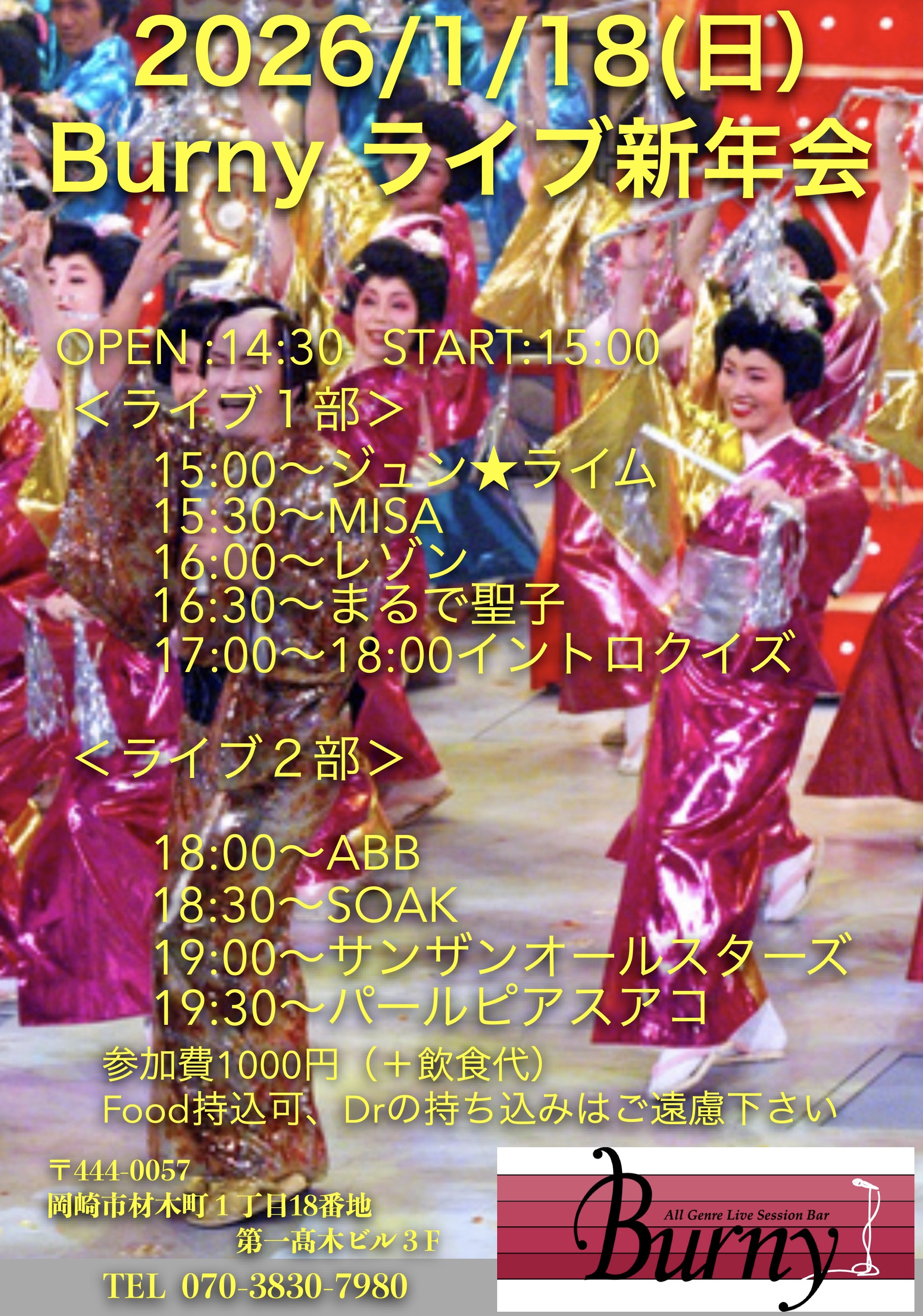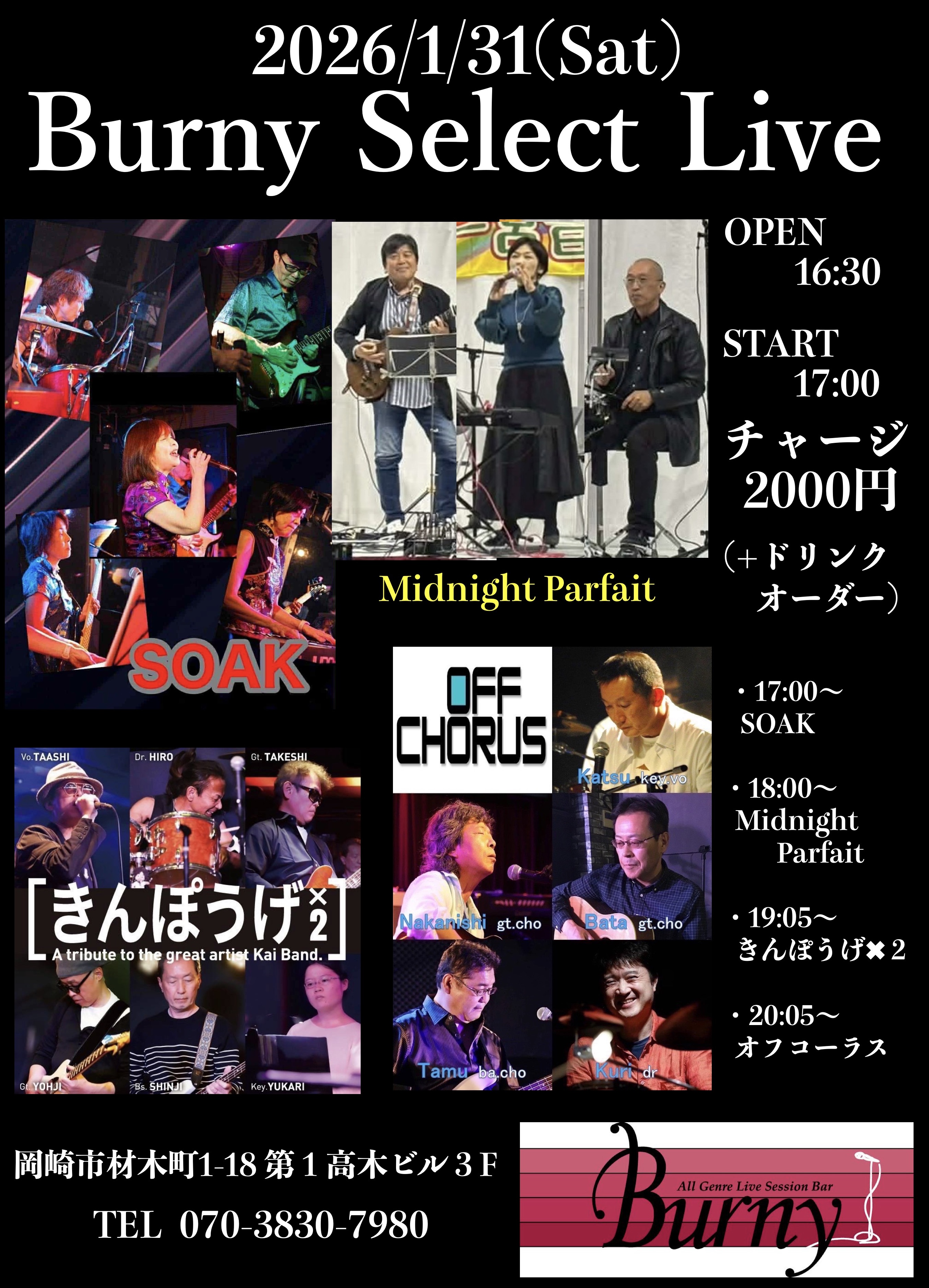 | 【ライブ】 1/31(土) 【 Burny Select Live】 バーニー 【愛知県岡崎市】 開場16:30 開演17:00 出演 17:00〜SOAK(邦楽、洋楽カバー)、18:00〜Midnight Parfaic(シティポップ)、19:05〜きんぽうげ✖️2(甲斐バンドカバー)、20:05〜オフコーラス(オフコースカバー) チャージ2000円(+ドリンクオーダー) SNSでシェア |