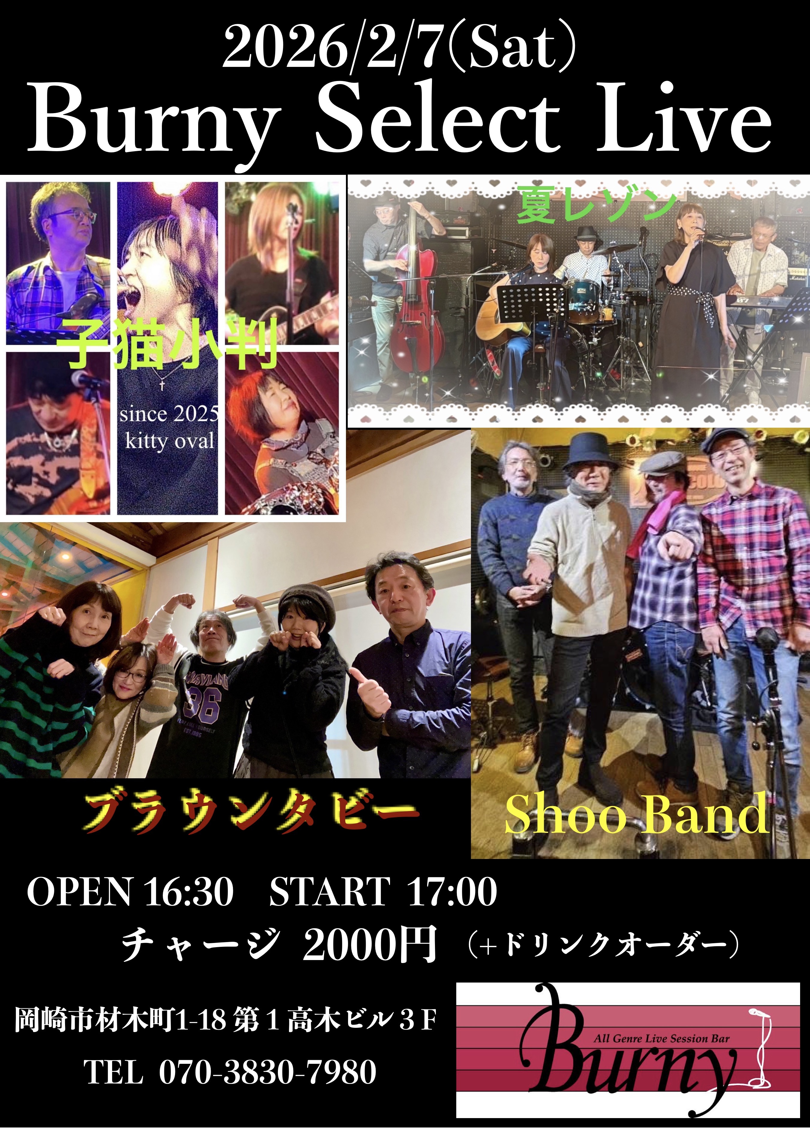 | 【ライブ】 2/7(土) 【 Burny Select Live】 バーニー 【愛知県岡崎市】 開場16:30 開演17:00 出演 レゾン(竹内まりやカバー)、Shoo Band(洋楽ロック)、ブラウンタビー(ジャズ、AOR)、子猫小判(洋楽ロック) チャージ2000円(+ドリンクオーダー) SNSでシェア |