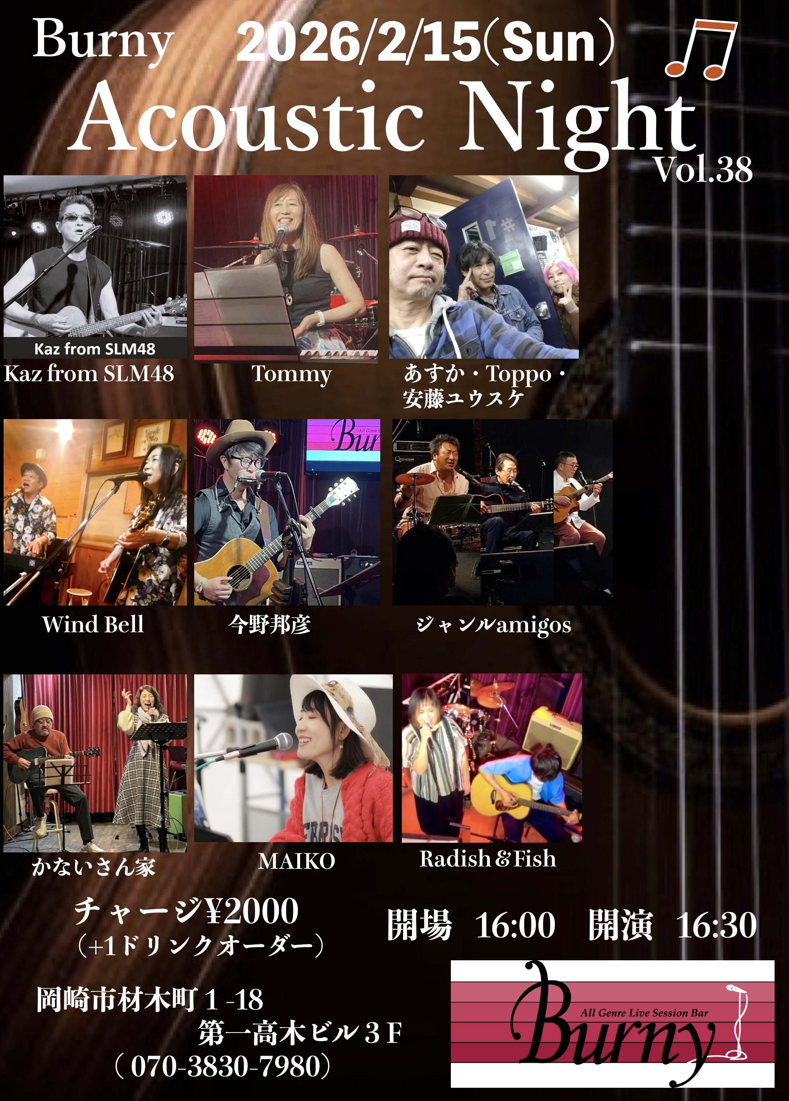 | 【ライブ】 2026/2/15(日) 【Burny Acoustic Night Vol.38】 バーニー 【愛知県岡崎市】 開場16:00 開演16:30 出演 Tommy、あすか+Toppo+安藤ユウスケ、Wind Bell、今野邦彦、Kaz from SLM48、ジャンルamigos、Radish& Fish、麻衣子,かないさん家 チャージ2000円(+ドリンクオーダー) |