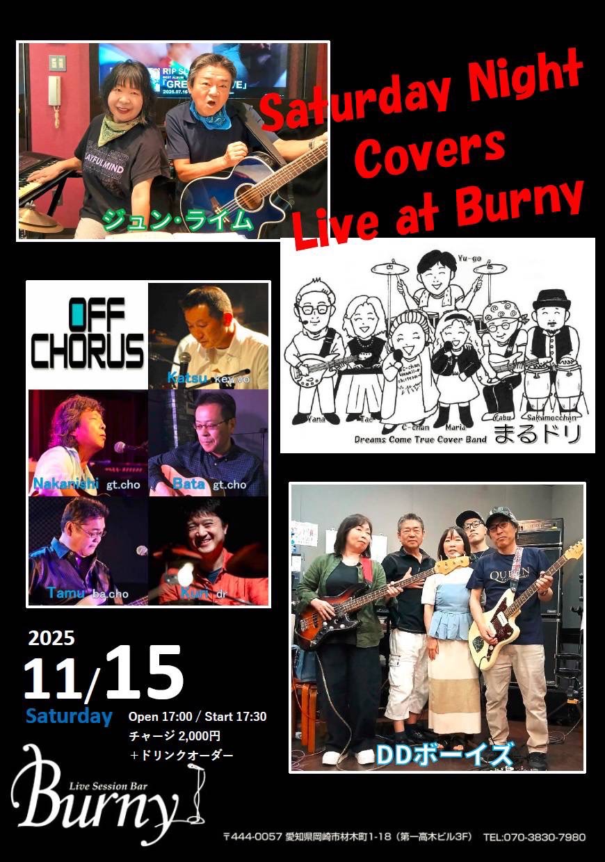 | 【ライブ】 11/15(土) 【 Saturday Night Covers】 バーニー 【愛知県岡崎市】 開場17:00 開演17:30 出演 ジュンライム(邦楽ポップス)、まるドリ(ドリカム)、オフコーラス(オフコース)、DDボーイズ(甲斐バンド) チャージ2000円(+ドリンクオーダー) SNSでシェア |