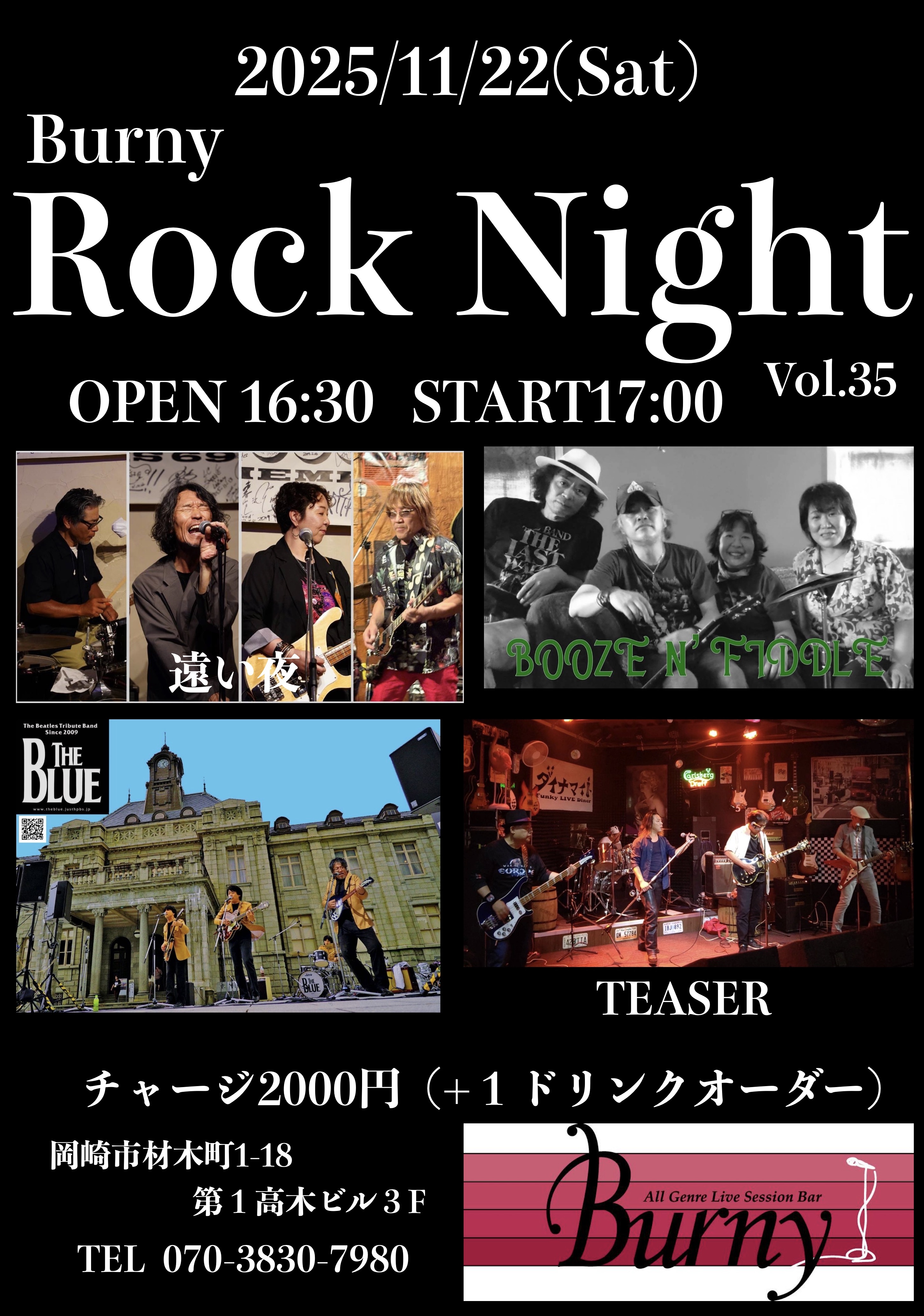 | 【ライブ】 11/22(土) 【 Burny Rock Night Vol,35】 バーニー 【愛知県岡崎市】 開場16:30 開演17:00 出演 遠い夜(オリジナルロック)、TEASER(70〜90’洋楽ロック)、ザ・ブルー(ビートルズ)Booze'N Fiddle(60〜70’洋楽ロック) チャージ2000円(+1ドリンクオーダー) SNSでシェア |