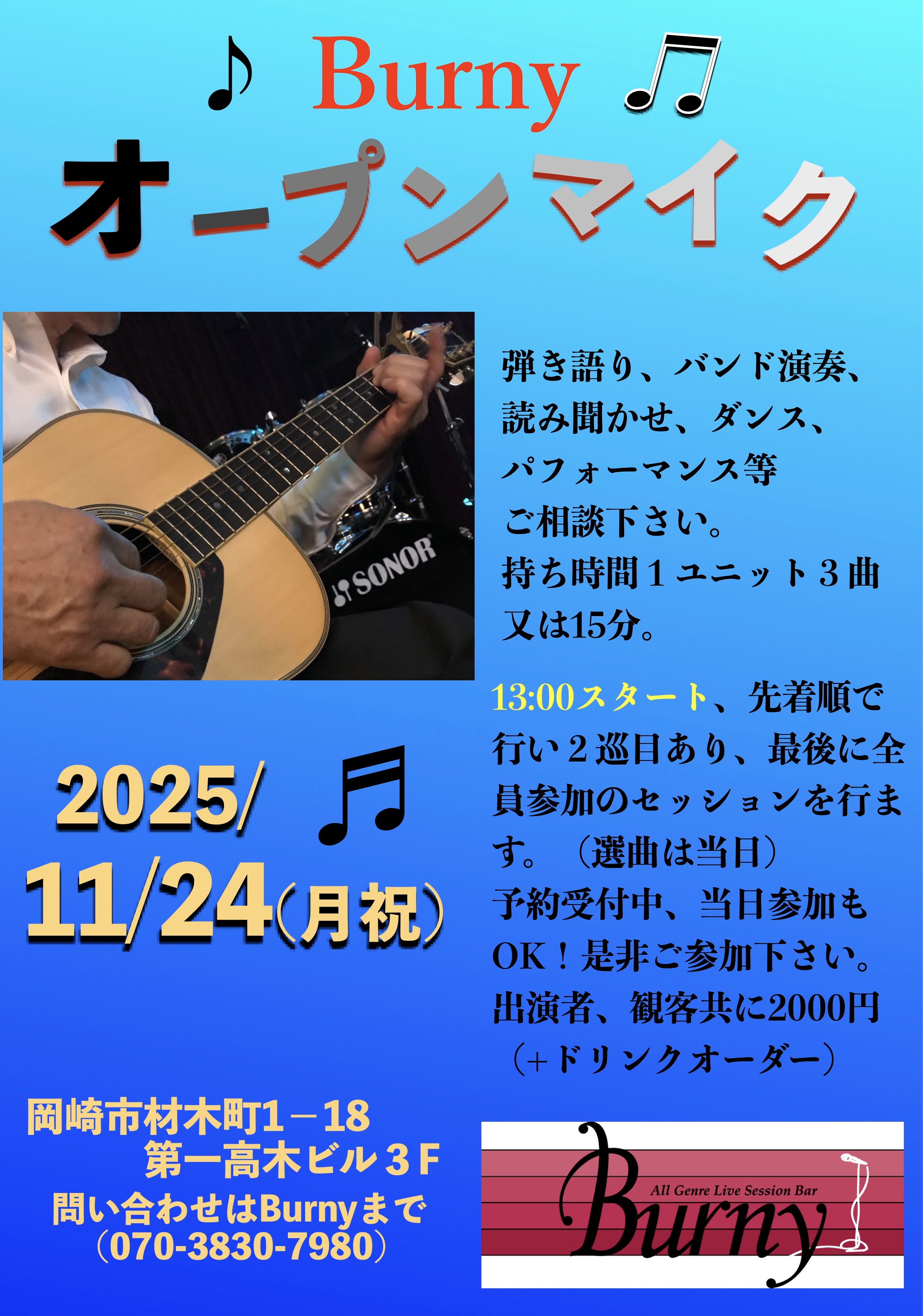 | 【ライブ】 12/29(月) 【 Burny 忘年会 LIVE】 バーニー 【愛知県岡崎市】 詳細未定 SNSでシェア |