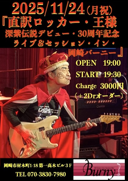 | 【ライブ】 11/24(月) 【 直訳ロッカー”王様” ,深紫伝説デビュー30周年記念ライブ&セッション・イン・バーニー】 バーニー 【愛知県岡崎市】 開場19:00 開演19:30 出演 王様 チャージ3000円(+2ドリンクオーダー) SNSでシェア |