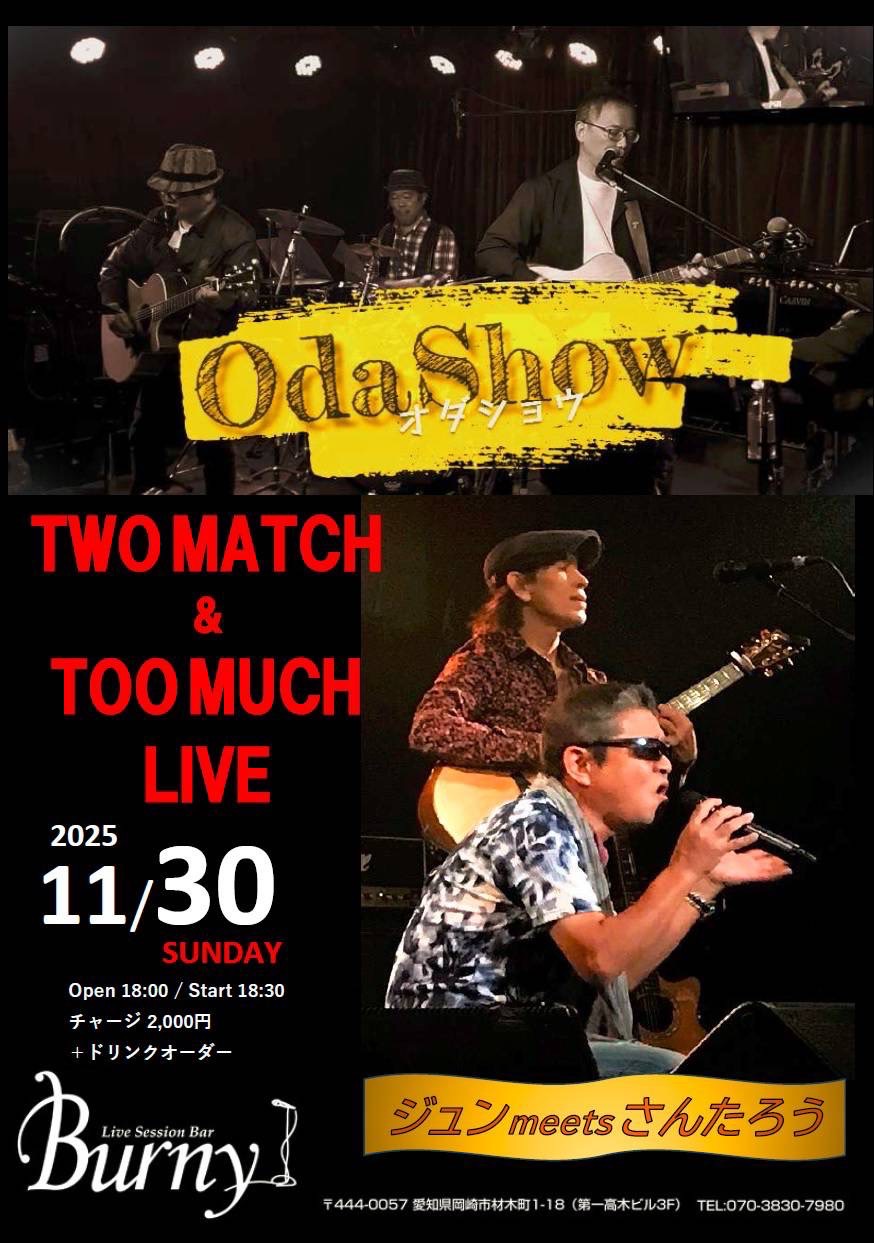 | 【ライブ】 11/30(日) 【 TOW MATCH & TOO MUCH LIVE】 バーニー 【愛知県岡崎市】 開場18:00 開演18:30 出演 OdaShow、ジュンmeetsさんたろう チャージ2000円(+1ドリンクオーダー) SNSでシェア |