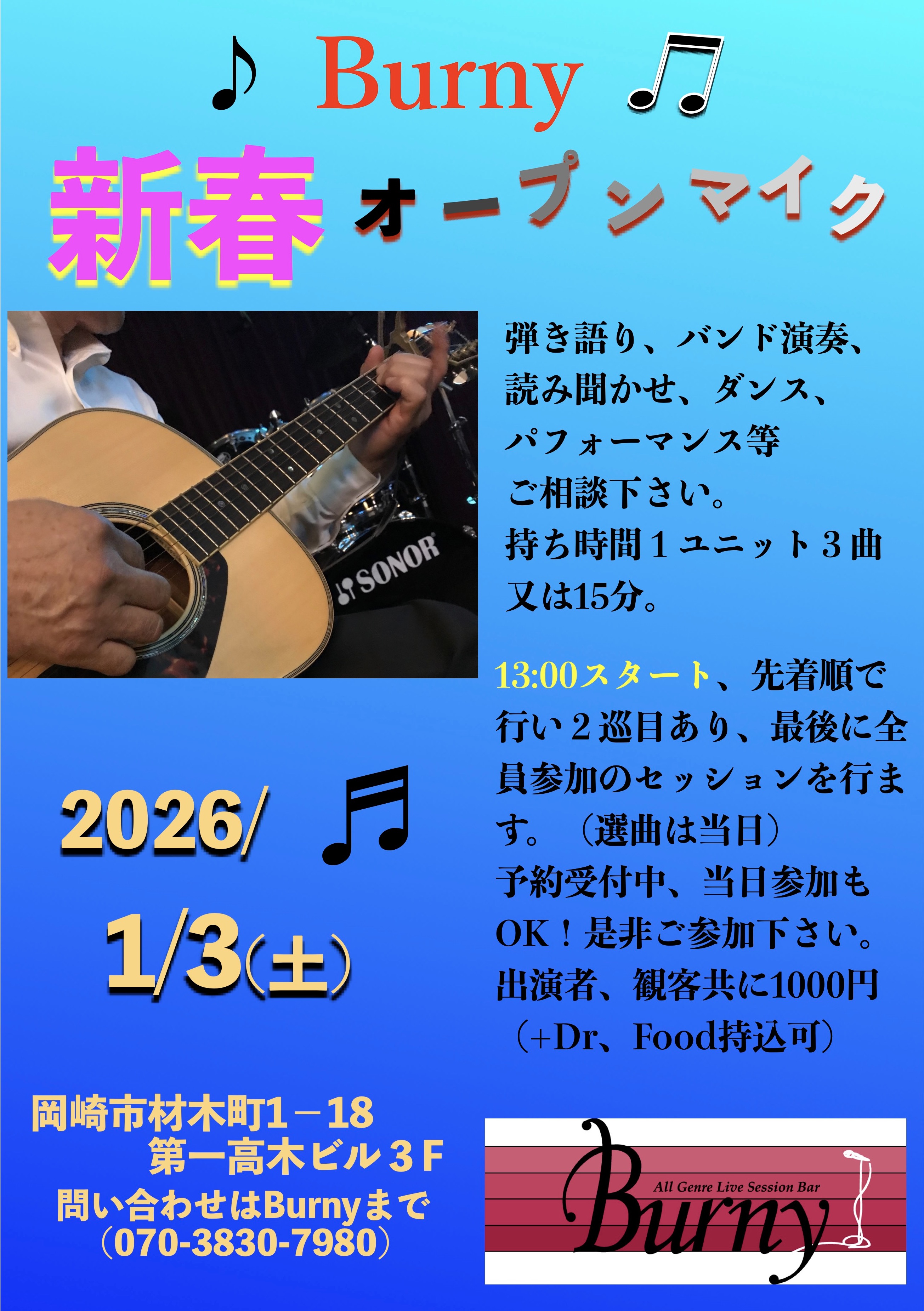 | 【ライブ】 1/3(土) 【 新春オープンマイク】 バーニー 【愛知県岡崎市】 開場12:30 開演13:00 出演者募集中、当日飛び入り歓迎! 一組3曲又は15分回し、弾語り、バンド、読み聞かせ、ダンス等どんなパフォーマンスでもOKです。 チャージ1000円(+1ドリンクオーダー FOOD持ち込み可) SNSでシェア |