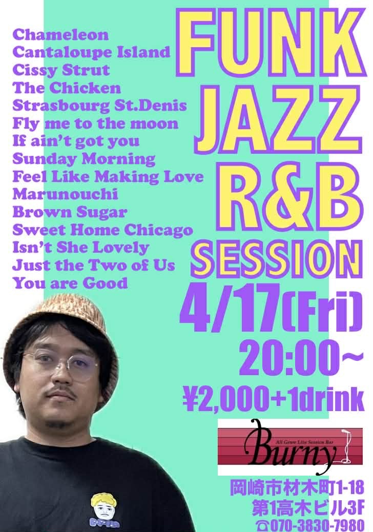| 【ライブ】 4/17(金) 【 FUNK、JAZZ、R&B Session】 バーニー 【愛知県岡崎市】 開場19:30 開演20:00 楽曲詳細はフライヤーをご覧ください。 チャージ2000円(+ドリンクオーダー) SNSでシェア |