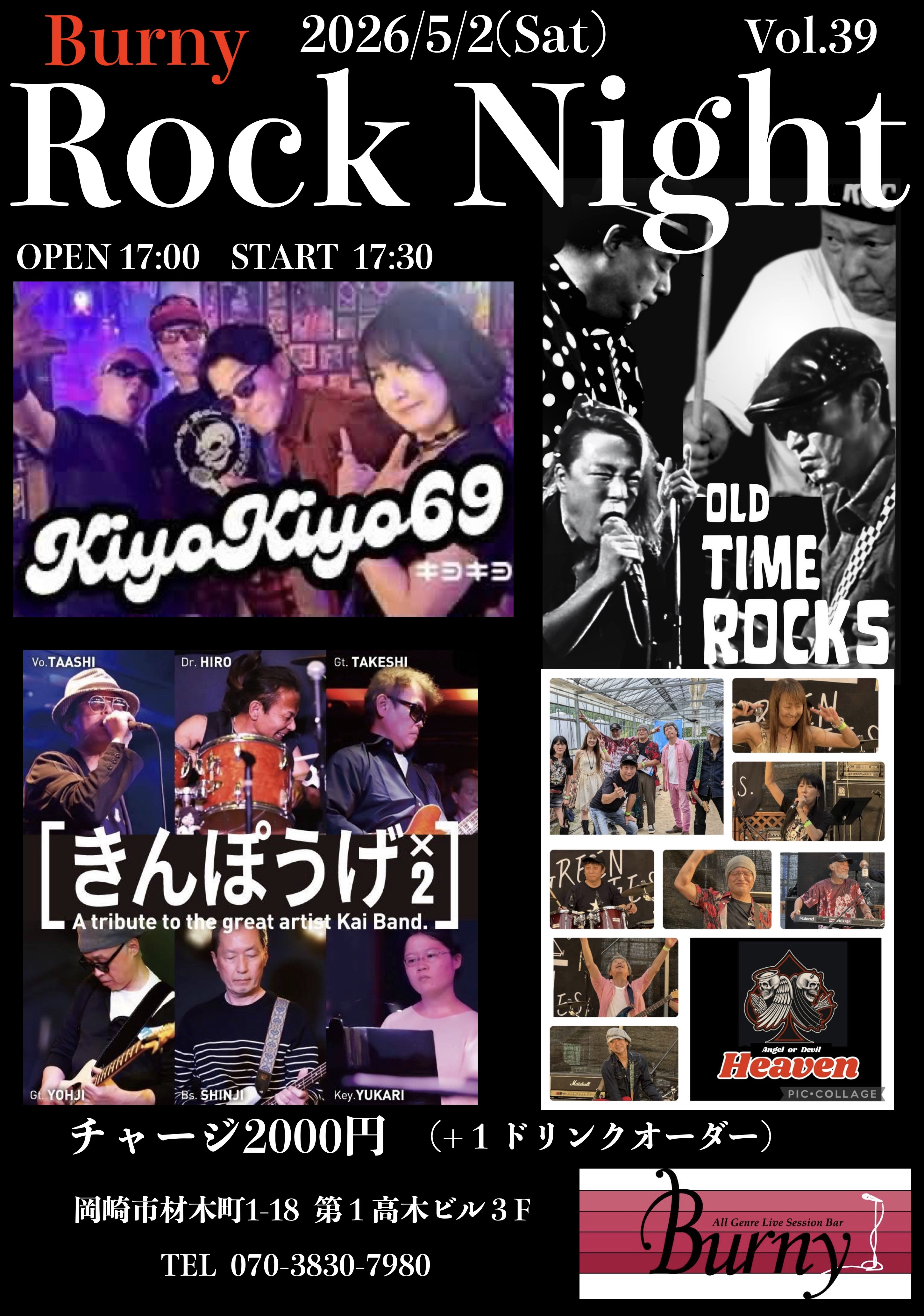 | 【ライブ】 5/2(土) 【 Burny Rock NightVol.39】 バーニー 【愛知県岡崎市】 開場17:00 開演17:30 出演 KiyoKiyo69(松田聖子ロックカバー)、OLD TIME ROCKS(洋楽ロックカバー)、きんぽうげ×2(甲斐バンドカバー)、Heaven(浜田麻里カバー) チャージ2000円(+ドリンクオーダー) SNSでシェア |