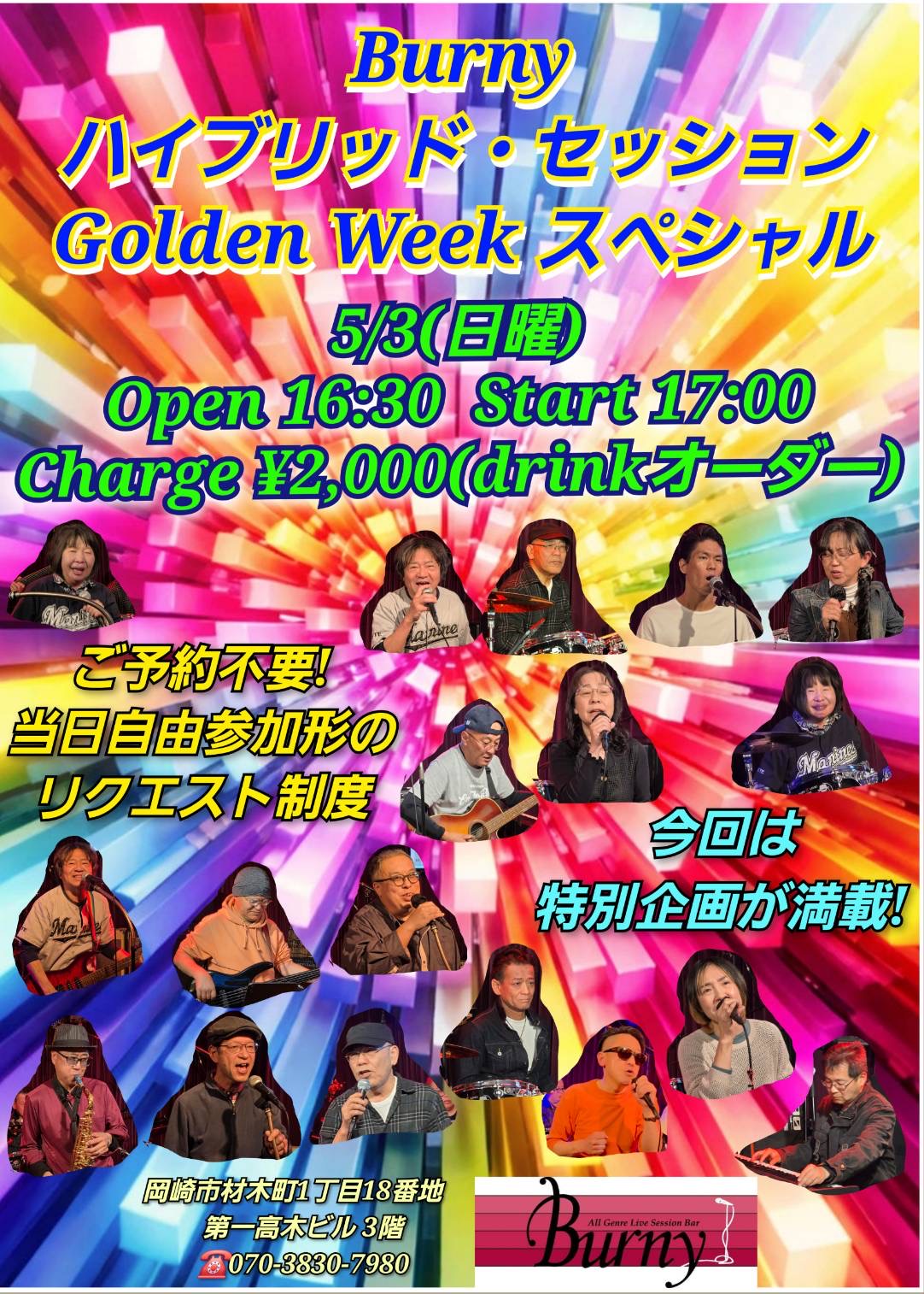 | 【ライブ】 5/3(日) 【 ハイブリッドセッションGWスペシャル】 バーニー 【愛知県岡崎市】 詳細未定 SNSでシェア |