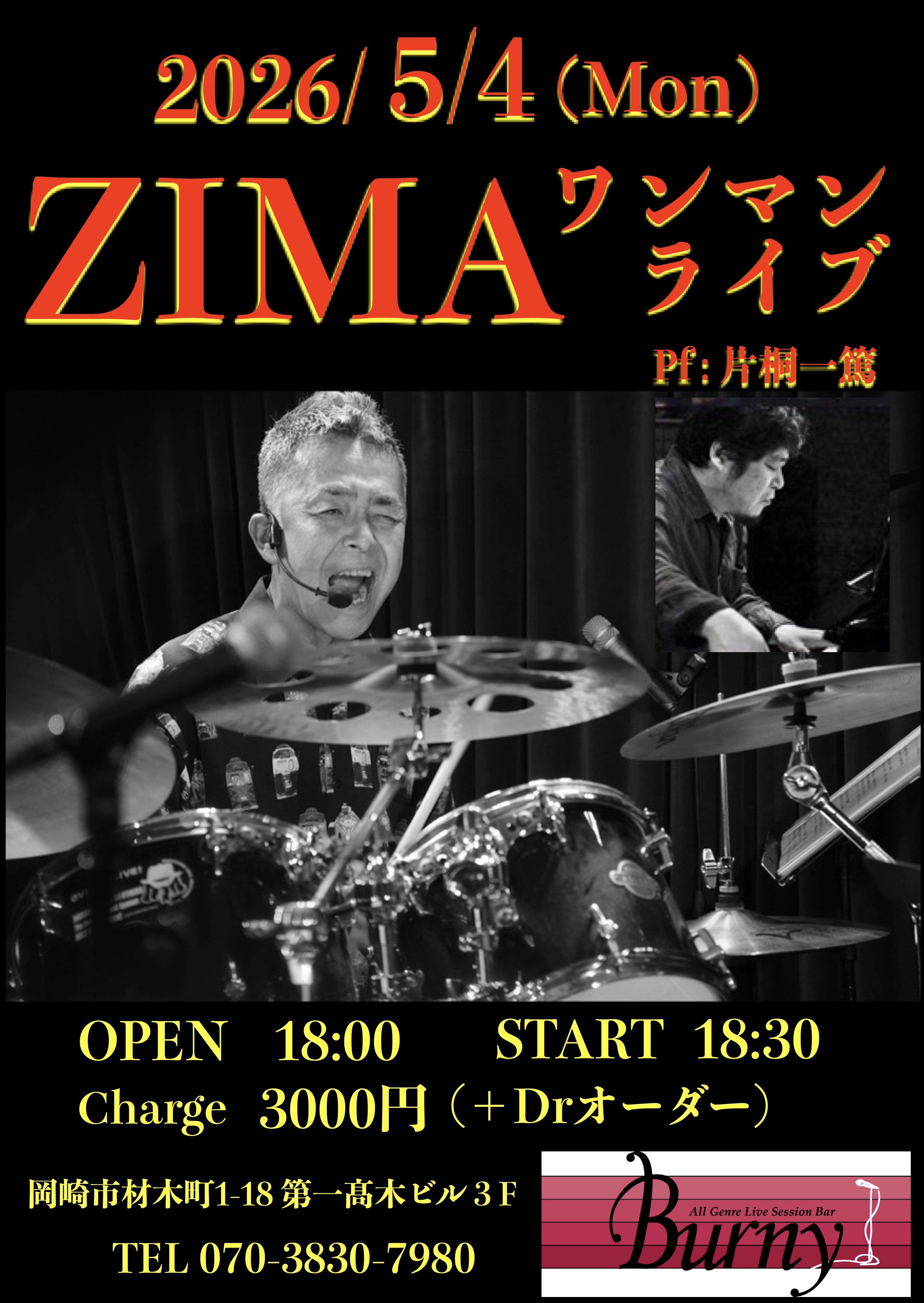 | 【ライブ】 5/4(月) 【 ZIMAワンマンライブ】 バーニー 【愛知県岡崎市】 開場18:00 開演18:30 出演 ZIMA、片桐一篤 チャージ3000円(ドリンク別要オーダー) SNSでシェア |