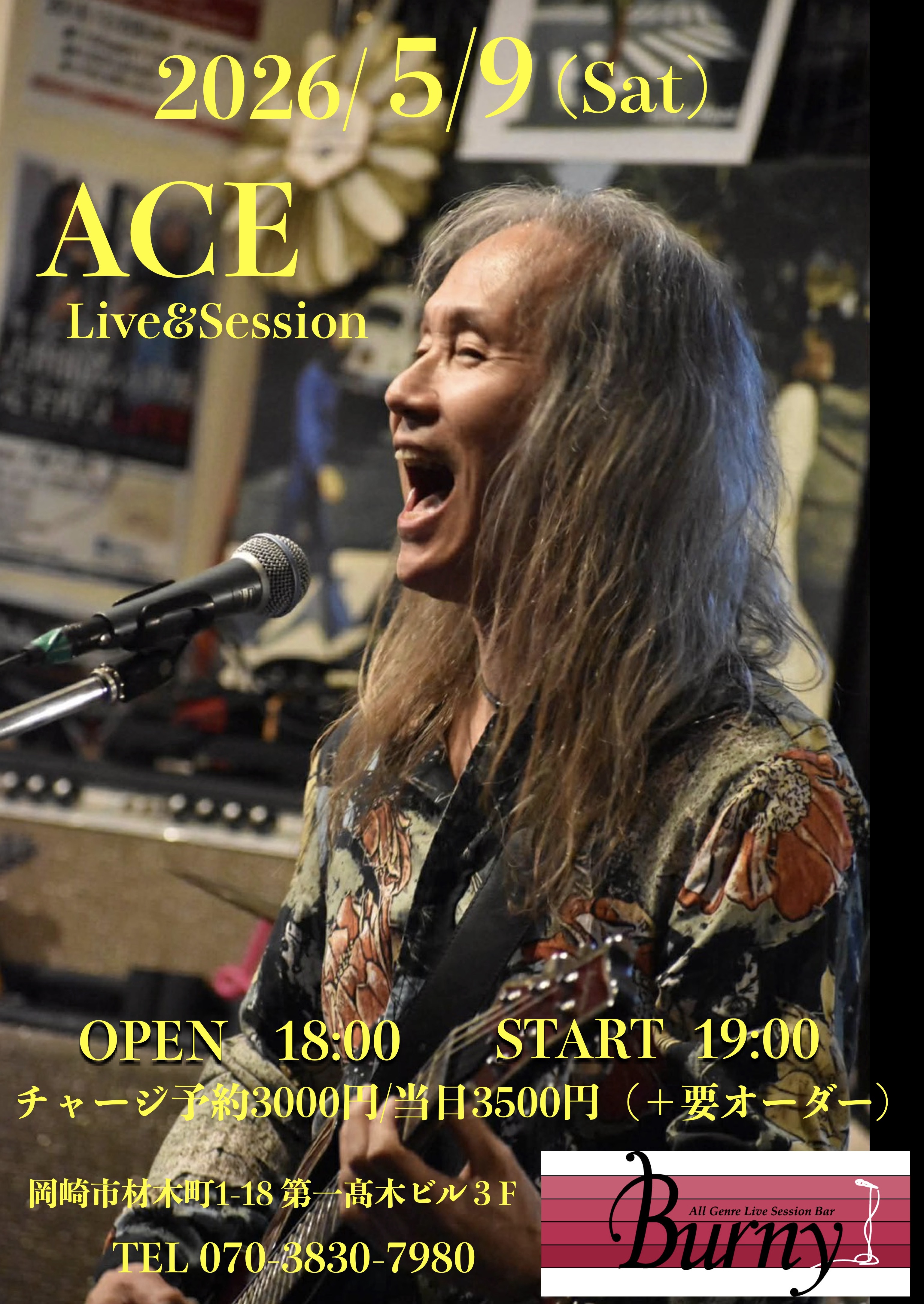 | 【ライブ】 5/9(土) 【 ACE Live& Session】 バーニー 【愛知県岡崎市】 開場18:00 開演19:00 出演 ACE チャージ予約3000円/当日3500円 (+要オーダー) SNSでシェア |