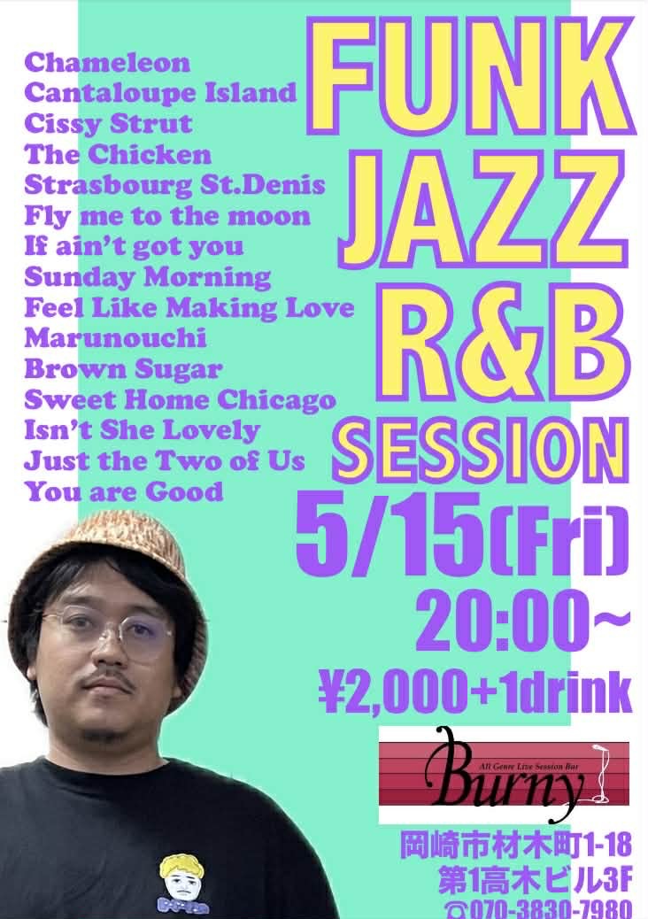 | 【ライブ】 5/15(金) 【 FUNK、JAZZ、R&B Session】 バーニー 【愛知県岡崎市】 開場19:30 開演20:00 楽曲詳細はフライヤーをご覧ください。 チャージ2000円(+ドリンクオーダー) SNSでシェア |