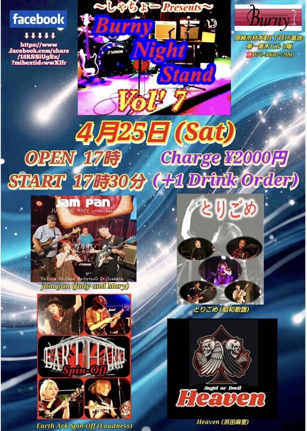 | 【ライブ】 4/25(土) 【 しゃちょーPresents Burny Night Stand Vol,7】 バーニー 【愛知県岡崎市】 開場17:00 開演17:30 出演 jam pan(Judy and Mary)、とりごめ(昭和歌謡)、Earth Ark Spin-Off(Loudness)、Heaven(浜田麻里) チャージ2000円(+1ドリンクオーダー) SNSでシェア |