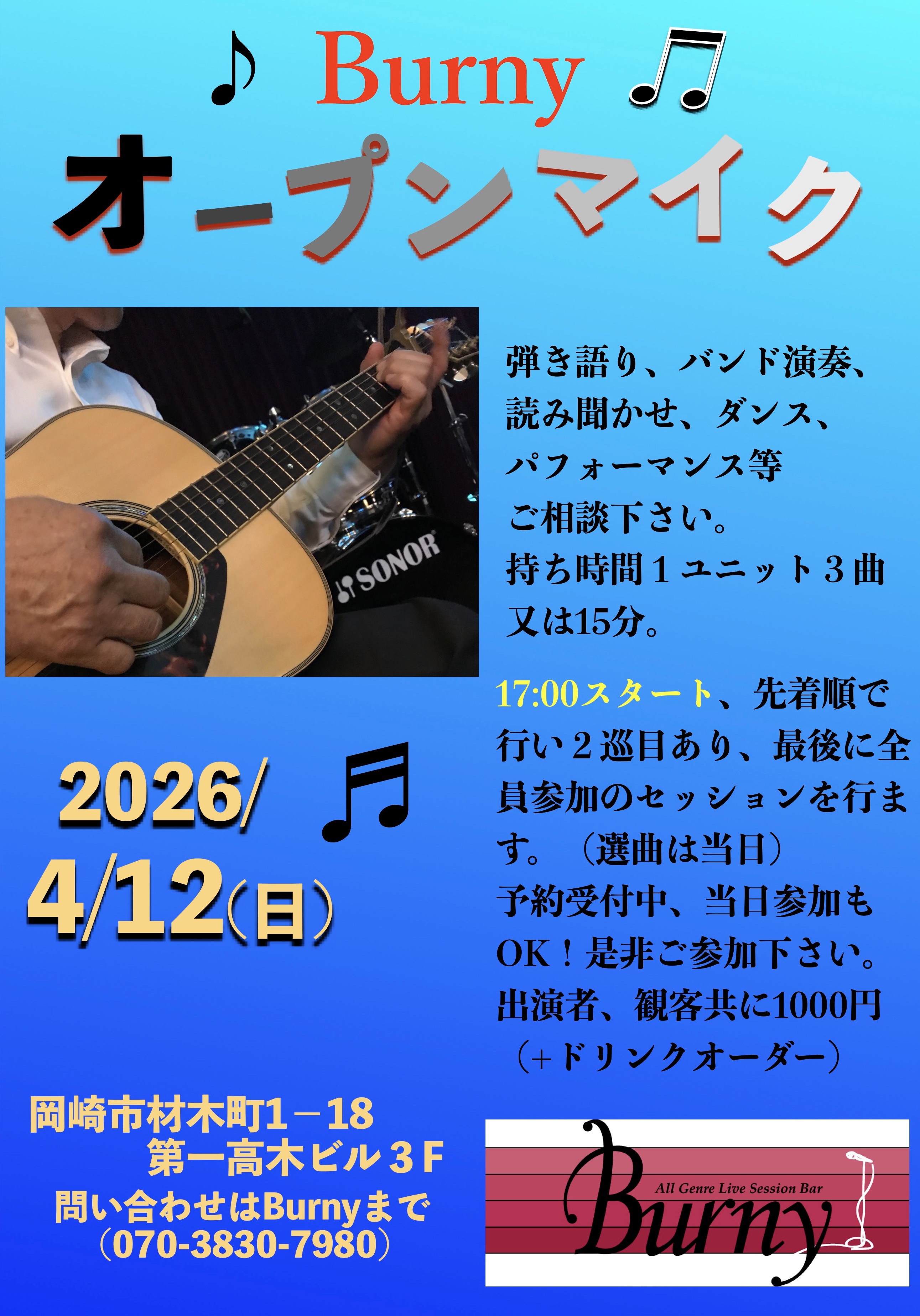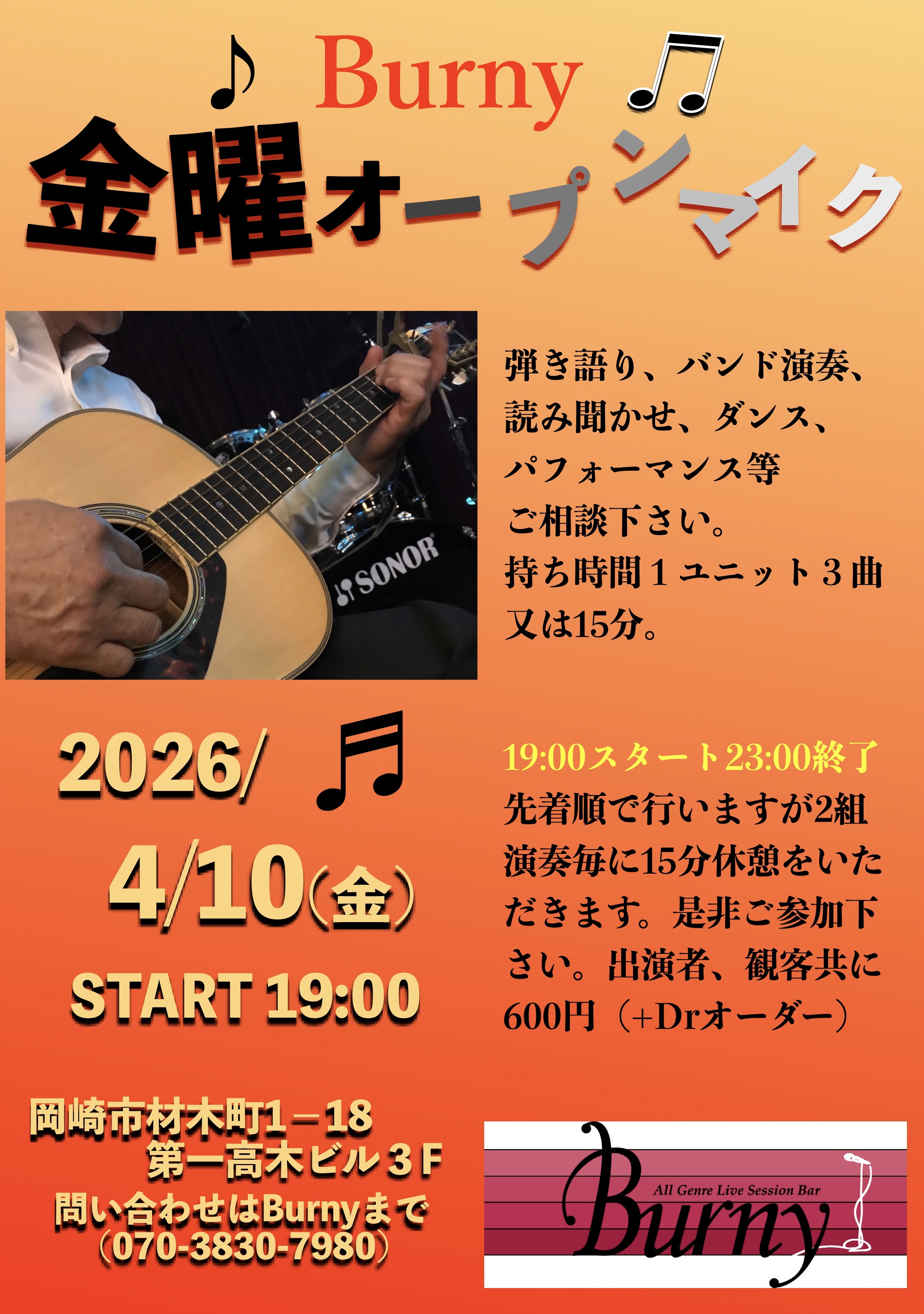 | 【ライブ】 4/10(金) 【 金曜オープンマイク】 バーニー 【愛知県岡崎市】 19時スタート23時終了 持ち時間1組3曲または15分、先着順で行い2組演奏毎に15分休憩を頂きます。 チャージ600円(+ドリンクオーダー) SNSでシェア |