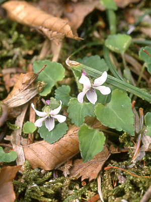 | トウカイスミレ 花はヒメミヤマスミレと比べると,唇弁が大きい。地色が純白でなくてわずかに淡紫色を帯びるのも特徴(愛知県豊根村) |