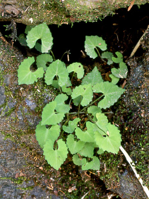 トウカイスミレ 葉は心形。花後はヒメミヤマスミレに似てくるが,披針形にまで細長くなることはない(愛媛県筒上山) |